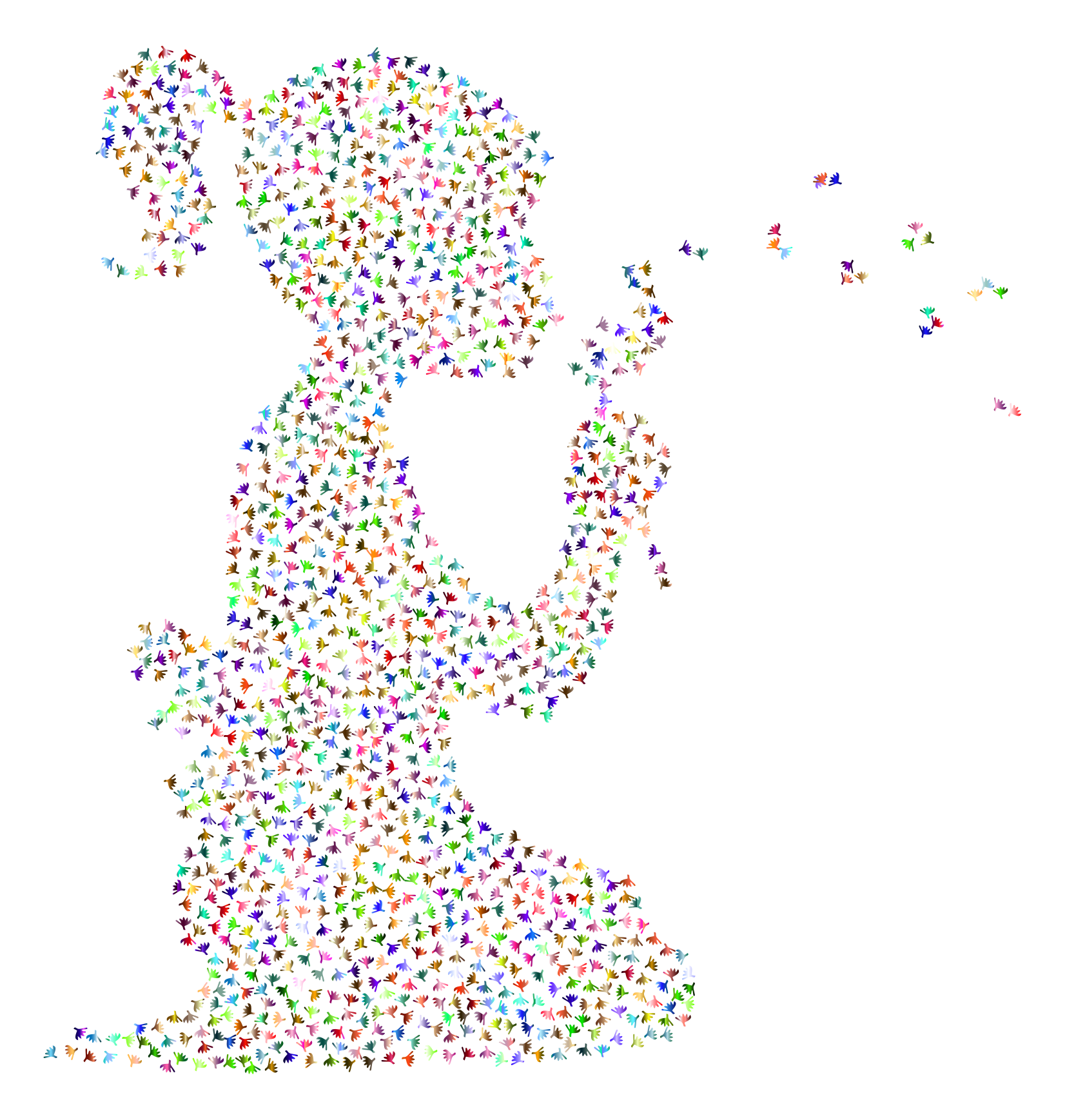 This features a little girl with her mouth open, seemingly blowing bubbles. She is surrounded by a multitude of colorful dots that make up the rest of the scene. These dots are scattered all around her, covering various parts of the image, including the background and foreground. The overall effect creates an interesting visual experience with the little girl as the focal point.