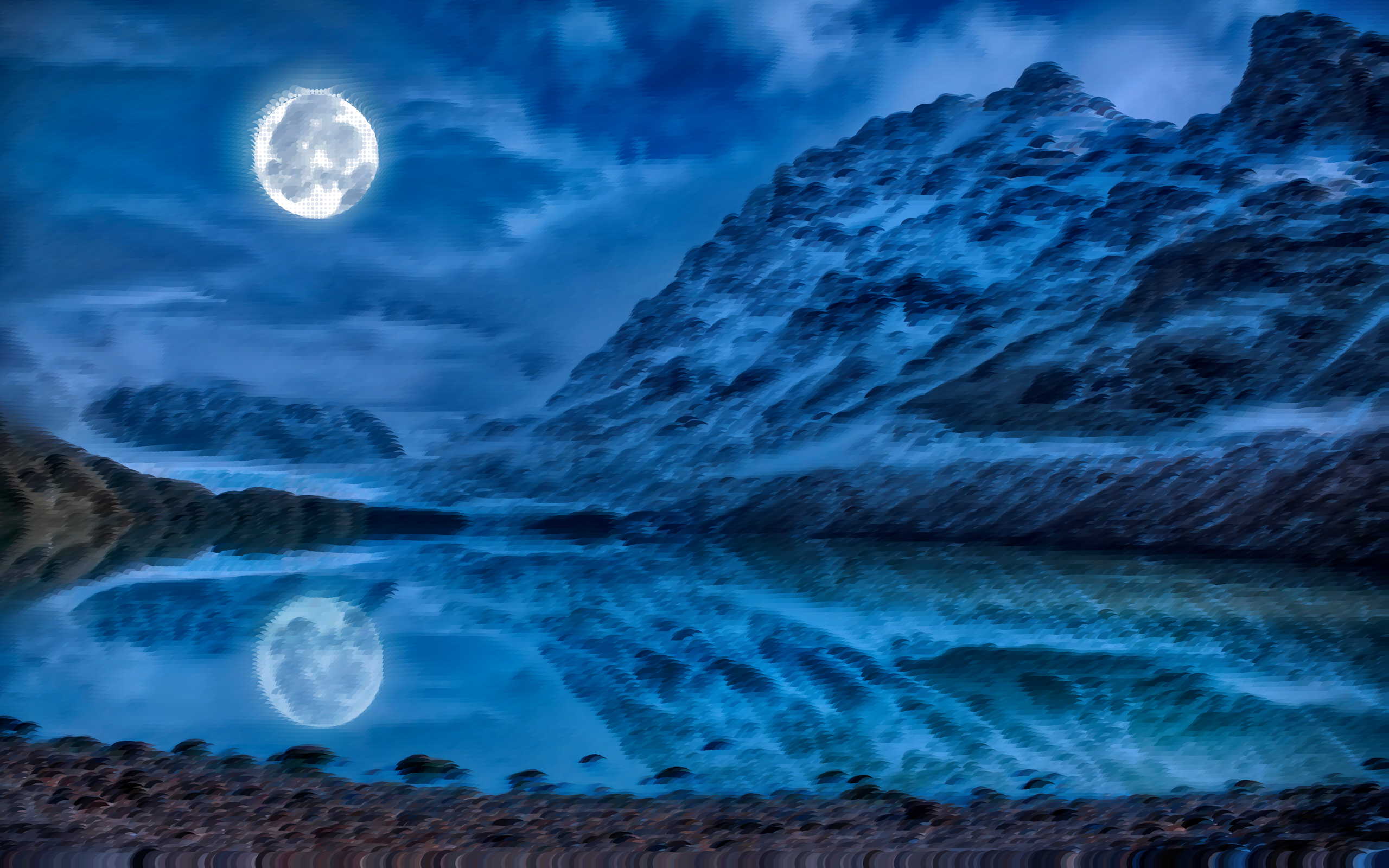 This features a serene scene of a lake at night, with the moon reflecting off its surface. A mountain can be seen in the background, adding to the picturesque setting. The sky above is filled with clouds, creating an atmospheric backdrop for this peaceful moment. The reflection of the moon on the water creates a sense of calmness and tranquility, making it an ideal spot for relaxation or contemplation.