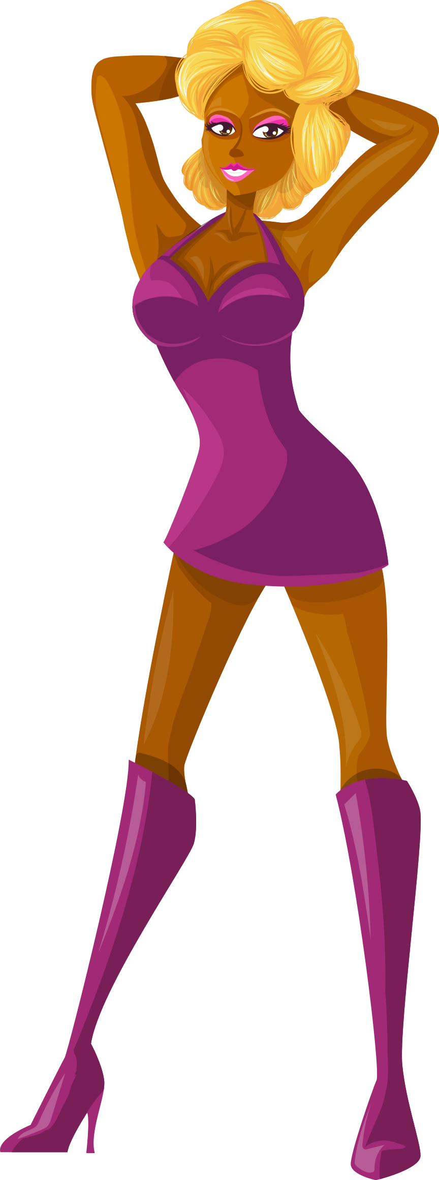 This features a cartoon woman wearing a pink dress and high heels. She is posing for the camera, with her hands on her hips and one hand on her head. Her outfit appears to be a mix of a lingerie set and a dress, giving her an exotic look. The woman's pose suggests confidence and allure, as she showcases her unique style in this artistic representation.