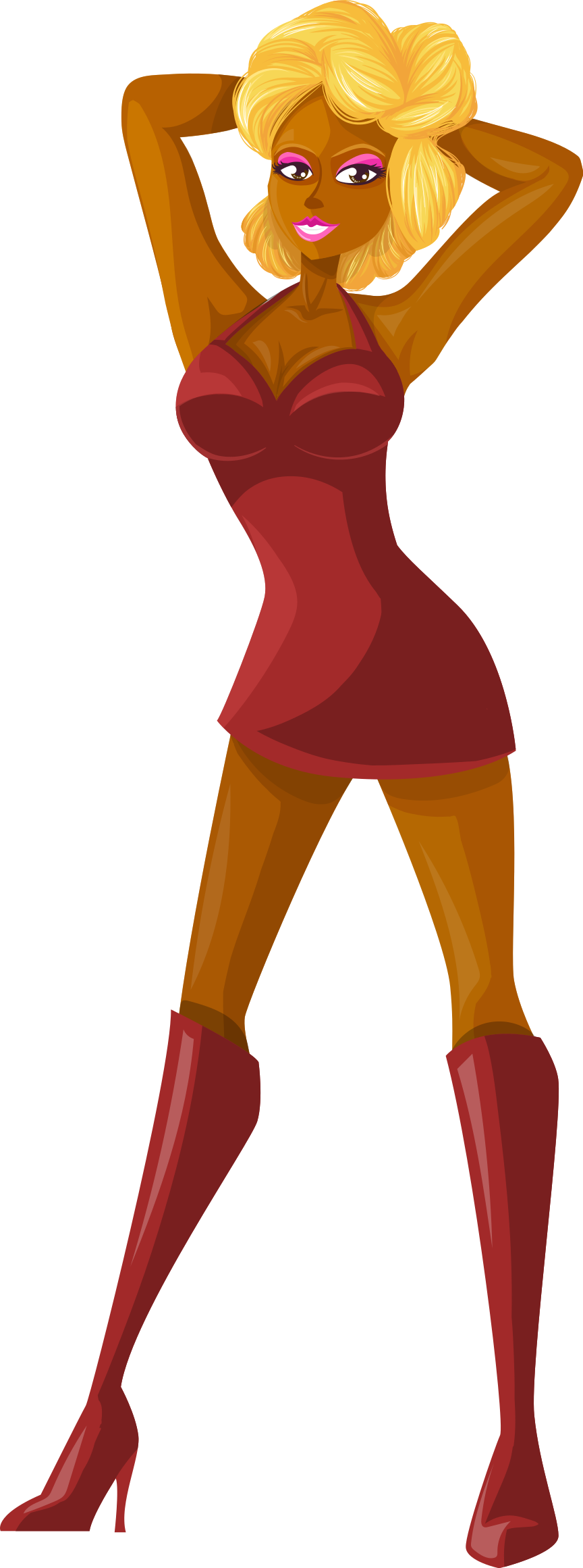 This features a cartoon woman wearing a red dress and high heels. She is posing for the camera, with her hands on her hips and one hand on her head. Her outfit appears to be a combination of a lingerie set and a dress, giving her an alluring appearance. The woman's pose suggests confidence and poise, as she showcases her attire in this artistic representation.