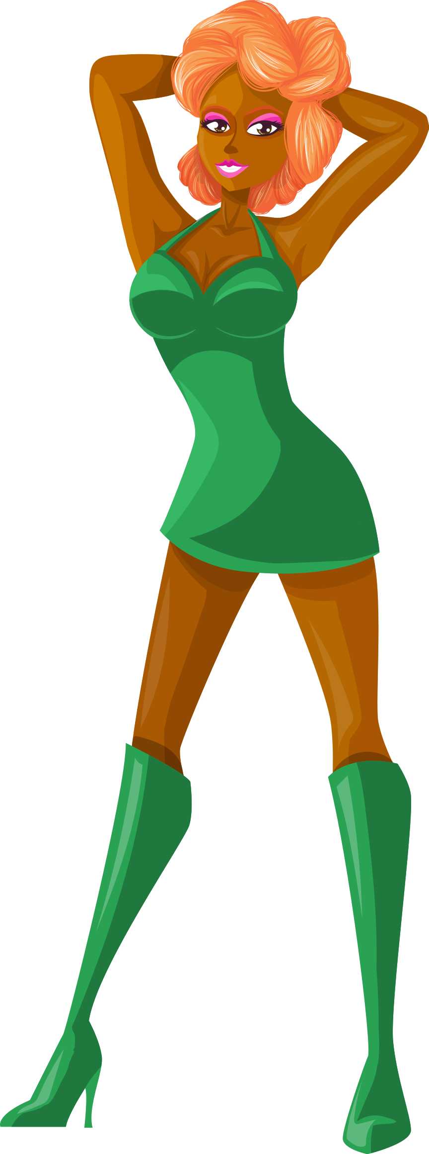 This features a cartoon woman wearing a green dress and high heels. She is posing for the camera, with her hands on her hips and one hand on her head. Her outfit appears to be inspired by the character Daphne from Scooby Doo. The woman's pose suggests confidence and poise as she showcases her attire.