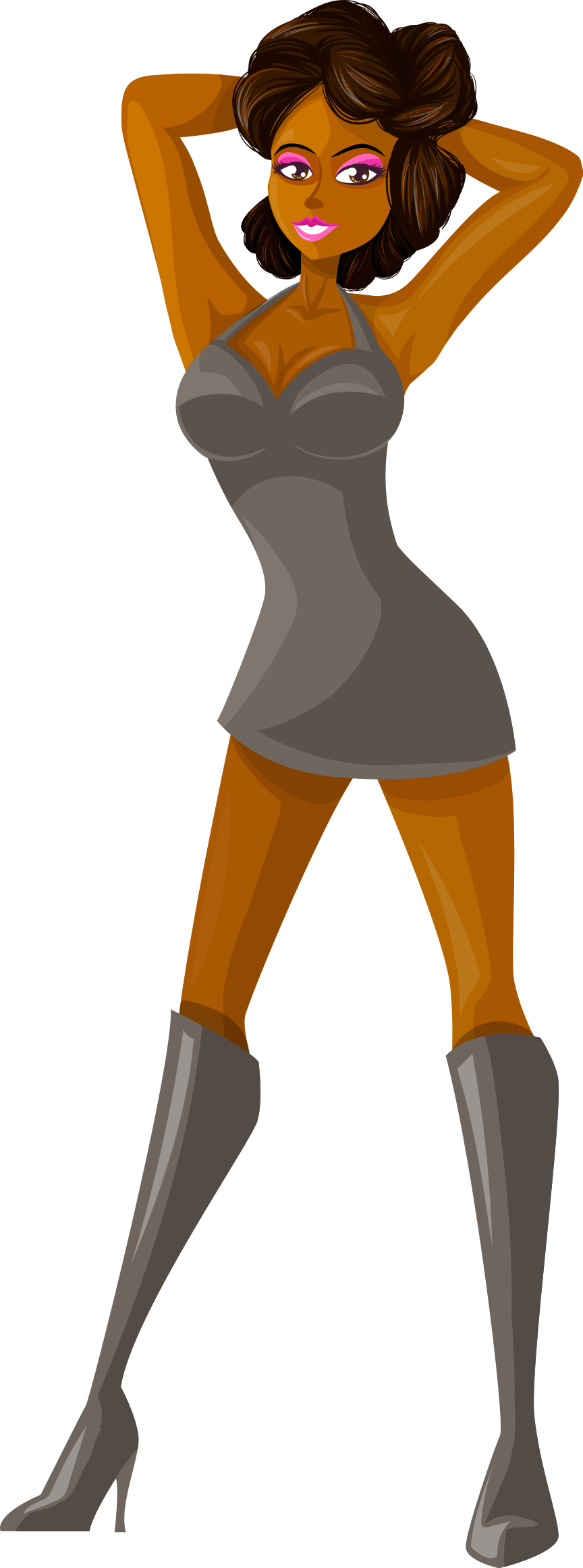 This features a woman in a grey dress, standing with her hands on her hips. She is wearing high heels and has a confident pose. Her outfit appears to be stylish and elegant, making for an attractive visual display. The woman's posture suggests that she might be posing for the camera or simply enjoying her time in the dress. Overall, the image captures a moment of self-assurance and poise from the woman in the grey dress.