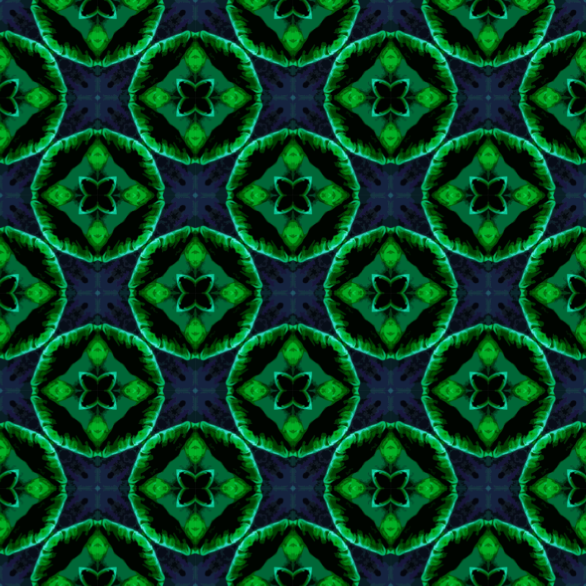 This features a green and black patterned design, which appears to be a close-up of a seamless pattern. This pattern is composed of multiple circles arranged in various positions, creating an intricate and visually appealing design. The circles are of different sizes and shapes, adding depth and complexity to the overall composition. The combination of green and black creates a striking contrast that makes the pattern stand out against any background it may be used on. This design could be utilized for various purposes such as wallpaper, fabric patterns or even digital artwork.