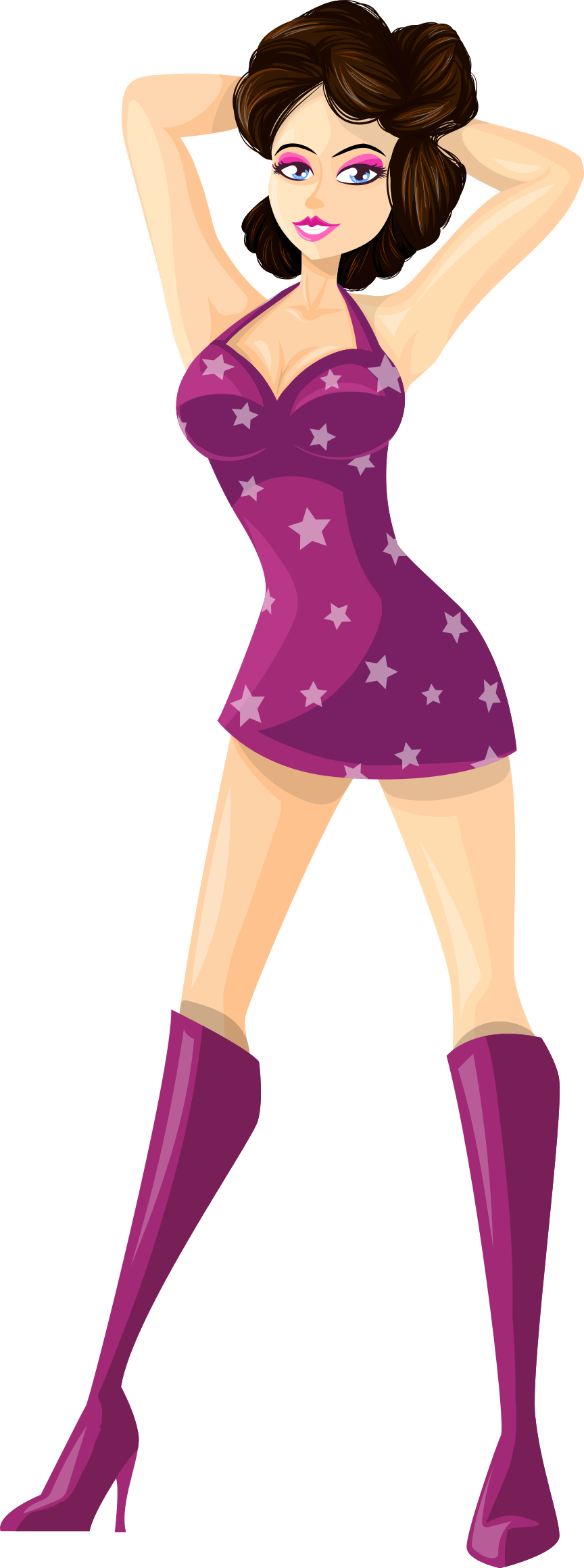 This features a cartoon woman wearing a purple dress with stars on it. She is posing for the camera, striking an attractive pose. Her outfit consists of a tight top and shorts, which accentuate her figure. The woman's legs are crossed in front of her as she confidently displays her attire. The overall scene exudes a sense of confidence and allure.