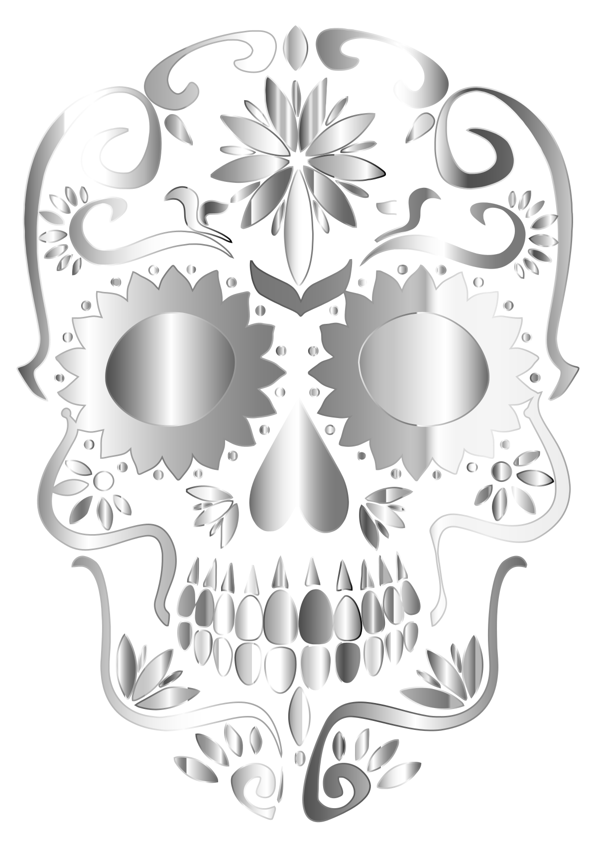 This features a silver, intricately designed skull with a flower on each side. The skull is adorned with various decorative elements such as leaves and flowers, giving it an artistic and unique appearance. The design of the skull appears to be inspired by Mexican culture, adding a touch of cultural flair to its overall look. The silver color of the skull gives it a shiny and polished appearance, making it stand out against any background.