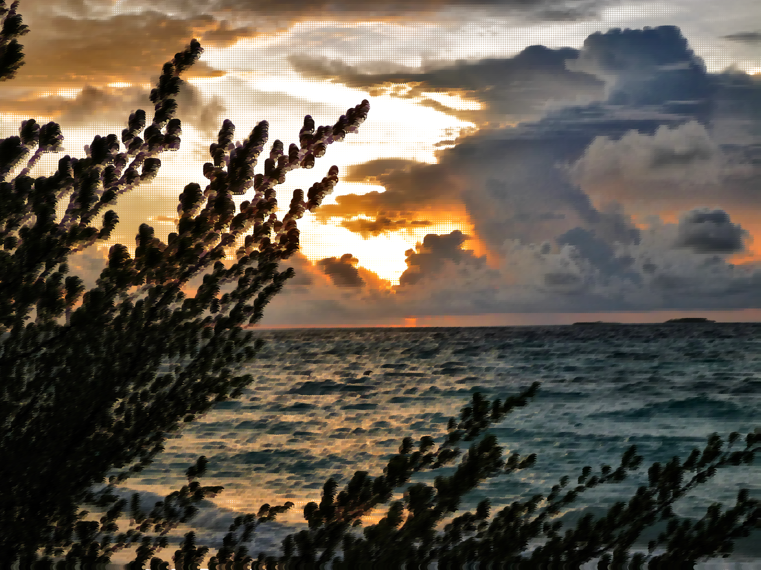 This captures a beautiful sunset over the ocean, with the sun setting behind some trees. The sky is filled with clouds, creating an atmospheric backdrop for the scene. The sunlight reflects off the water, casting a warm glow on the surface. In the distance, there are several boats floating on the water, adding to the serene and picturesque view of the ocean at dusk.