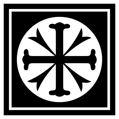 This features a black and white circular design with an intricate pattern. It appears to be a decorative square ornament, possibly used for religious or spiritual purposes. The design is composed of multiple intersecting lines that create a unique visual effect. The overall appearance of the ornament suggests it could be a symbol or emblem representing faith or beliefs.