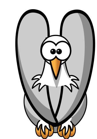 This features a cartoon bird with its wings closed, sitting on the ground. It has a white head and yellow beak, giving it a unique appearance. The bird's wings are folded inward, creating an interesting visual effect. This whimsical character could be used for various purposes such as children's books or educational materials to teach about birds and their habitats.