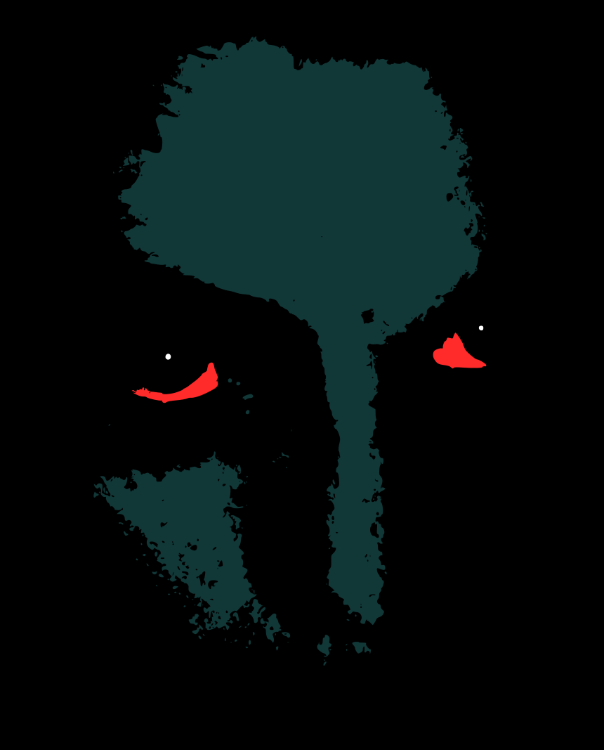 This is a black and white drawing of a face with red eyes. The face has a green background, giving it an eerie appearance. The eyes are large and prominent, taking up most of the space in the drawing. The overall effect is that of a demonic or ghostly figure.
