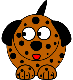 This features a cartoon dog with big eyes and a spotted pattern. It appears to be sitting down, possibly on the ground or in a chair. The dog's facial expression is quite expressive, giving it an amusing and playful appearance. The dog's body is covered in black dots, which adds to its unique and eye-catching design. Overall, this image captures a fun and whimsical moment with the spotted canine character.