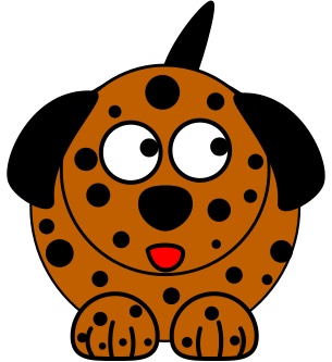 This features a cartoon dog with big eyes and a spotted pattern. It appears to be sitting down, possibly on the ground or in a chair. The dog's facial expression is quite expressive, giving it a funny and endearing appearance. Its large eyes are open wide, making it seem like it is looking directly at the viewer. The cartoon dog has a black nose and mouth, adding to its playful character. Overall, this image captures a lighthearted and amusing moment with a cute animal.