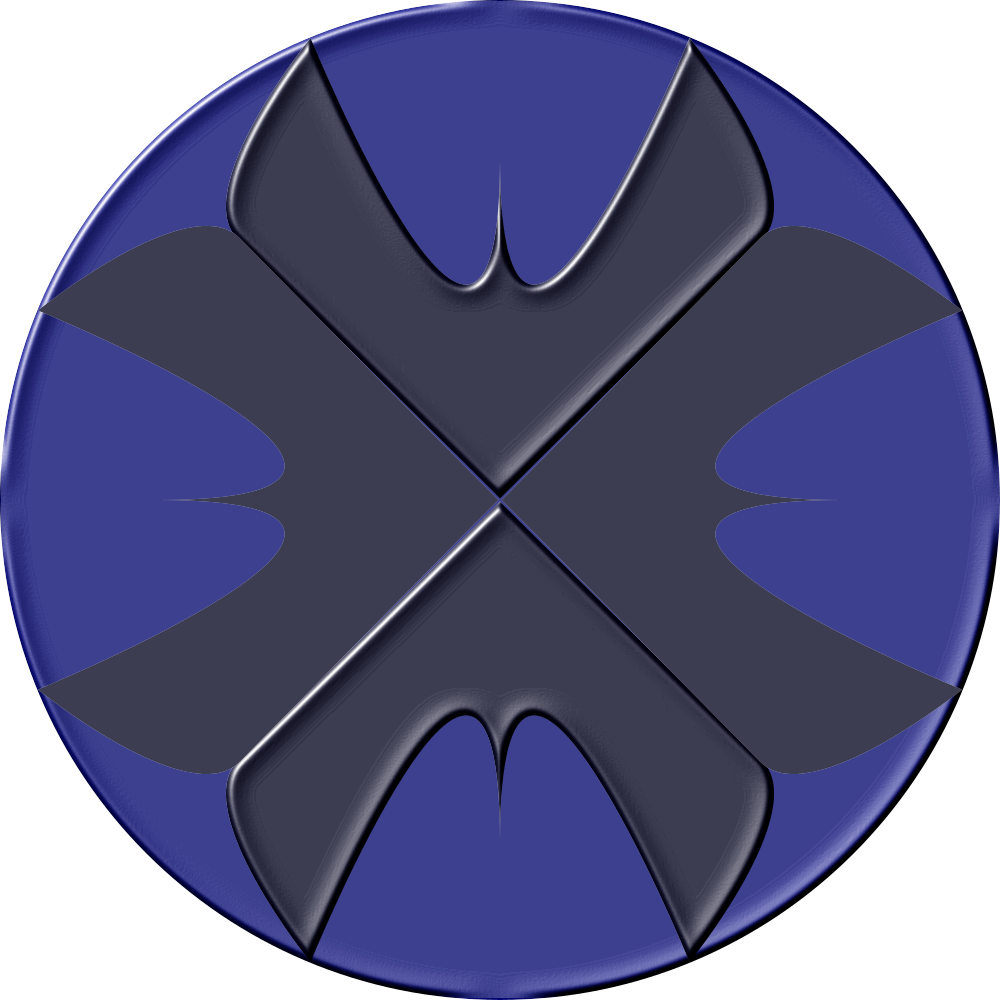 This features a blue circle with an intricate design on it. The design is shaped like a cross and has a black background, giving the appearance of a stylized batman logo. The cross-like shape is made up of two triangles, one larger than the other, which are connected at their centers to form the overall design. This unique and eye-catching image could be used for various purposes such as decoration or as an emblem representing a specific organization or cause.