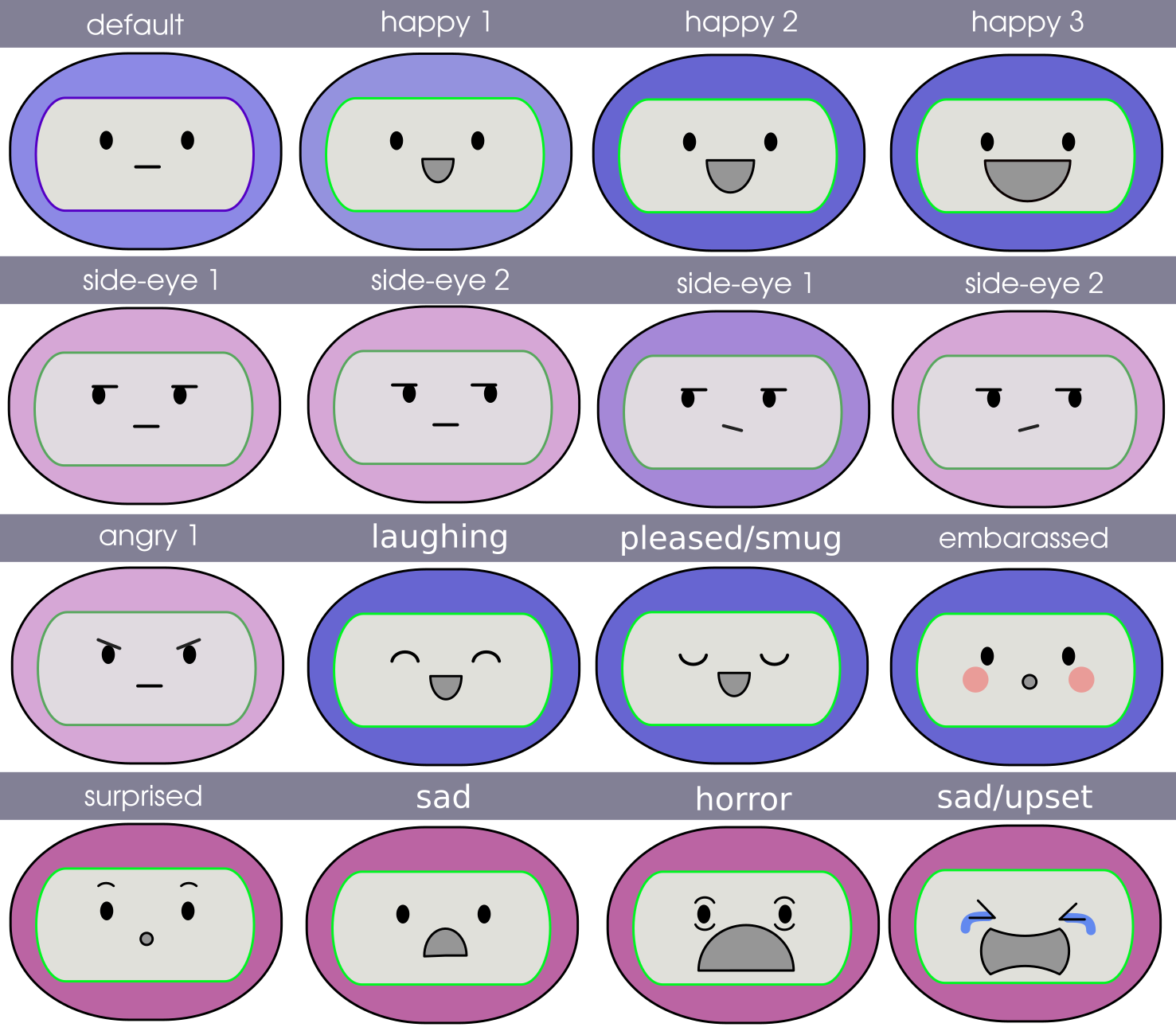 This displays a collection of various facial expressions for robots, showcasing different emotions and reactions. There are twelve distinct images in total, each featuring a unique expression that can be used to convey the robot's feelings or thoughts. These images include a mix of happy, sad, angry, surprised, and other emotions, providing a diverse range of options for those who want to add personality to their robots or other characters. The collection is presented in a grid-like pattern, making it easy to browse through the different expressions and find the one that best suits the situation.