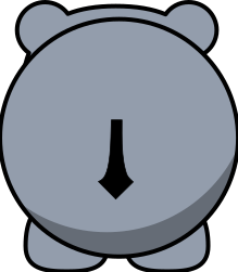 This features a large, round, gray teddy bear with an arrow pointing downwards. The teddy bear is the main focus of the picture and appears to be quite prominent in the scene. The arrow on the teddy bear's stomach adds a playful touch to the overall design.