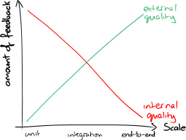 This features a graph with two red and green lines, one on the left side and another on the right. These lines are labeled as "External Quality" and "Internal Quality," respectively. Above these lines, there is a text box that reads "Feedback." Below the lines, there is a text box that says "Quality of Feedback." The graph appears to be a representation of how external quality affects internal quality in terms of feedback.