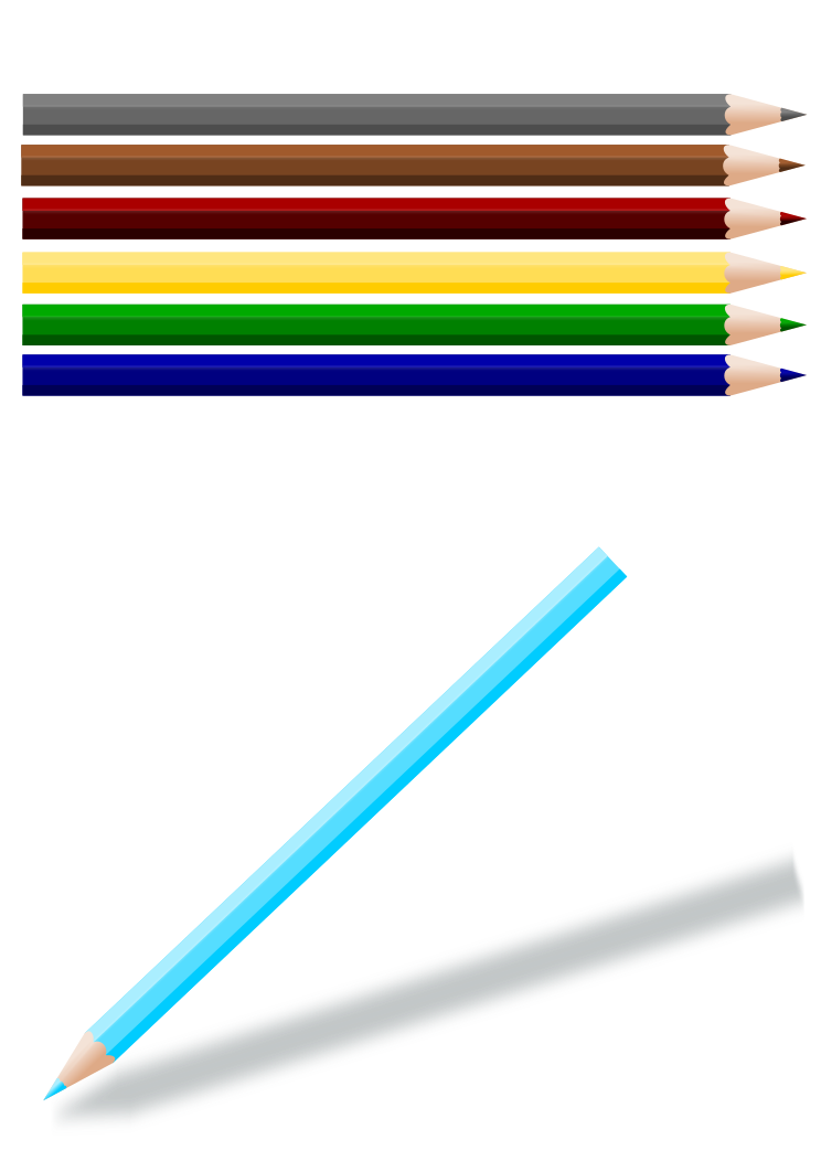 This features a row of six different colored pencils, each with varying shades and hues. They are arranged in a horizontal line, with the colors progressing from left to right: yellow, green, blue, red, brown, and black. In addition to the pencils, there is also a single blue pencil placed on its side, standing out among the row of colored ones. The combination of these various shades creates an interesting visual contrast against the white background.
