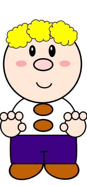 This features a cartoon character, specifically a young boy with blonde hair and a white shirt. He is wearing purple pants and has his hands outstretched as if he's waving or greeting someone. The character appears to be standing in front of a wall, which serves as the background for this illustration. This cartoon figure could potentially represent a friendly and approachable personality, making it an appealing character for children or those who enjoy lighthearted and fun imagery.