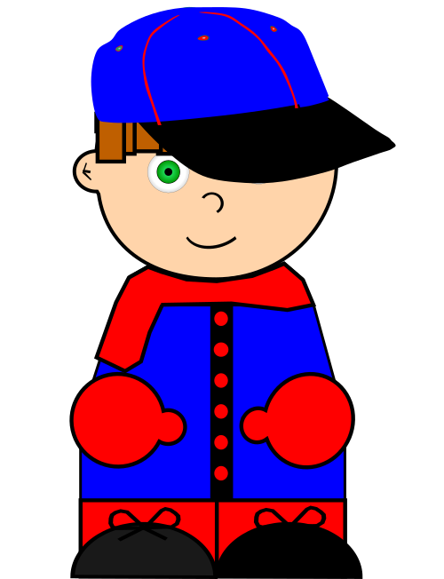 This features a cartoon character, possibly a boy or a young man, wearing a blue hat and red gloves. He is dressed in a red and blue jacket, giving him a colorful appearance. His eyes are green, adding to his unique look. The character appears to be standing confidently with his hands on his hips, showcasing his personality and style.