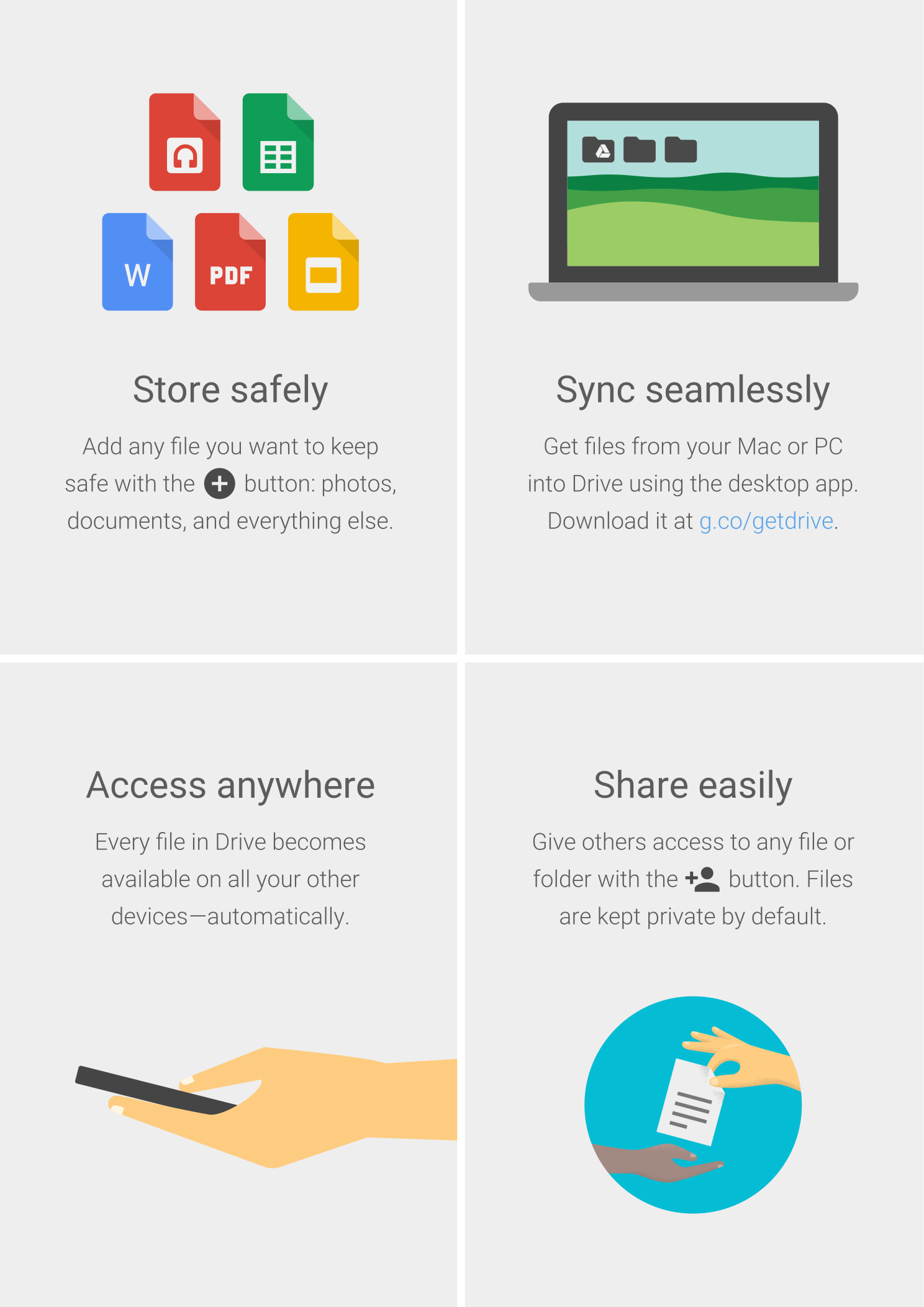 This is a four-panel infographic that showcases the benefits of using Google Drive. Each panel highlights different advantages, such as "Store Safely," "Sync Easily," and "Share Easily." These panels are accompanied by icons representing the features they describe. For example, the "Store Safely" panel has a cloud icon, while the "Sync Easily" panel displays a laptop icon. The infographic is designed to inform users about the convenience and security offered by Google Drive.