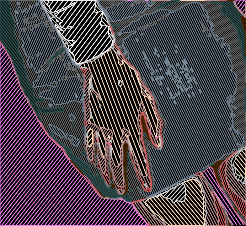This features a person's hand with their fingers spread out. The hand is positioned in the center of the frame, and it appears to be slightly blurry or distorted. The background consists of a colorful pattern that adds visual interest to the scene. The overall composition creates an artistic and dynamic representation of the human hand interacting with its environment.