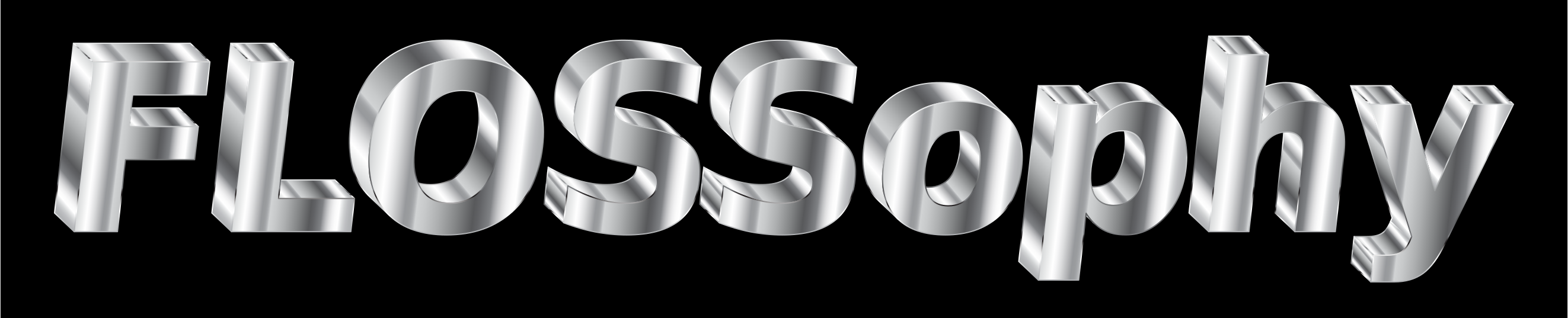 This is a close-up of the word "FLOSSophy" written in white letters on a black background. The word appears to be made up of two parts, with the first part being "FLOSS" and the second part being "osophy". The word itself seems to be an interesting combination of words, possibly representing a concept or idea related to technology or digital culture.