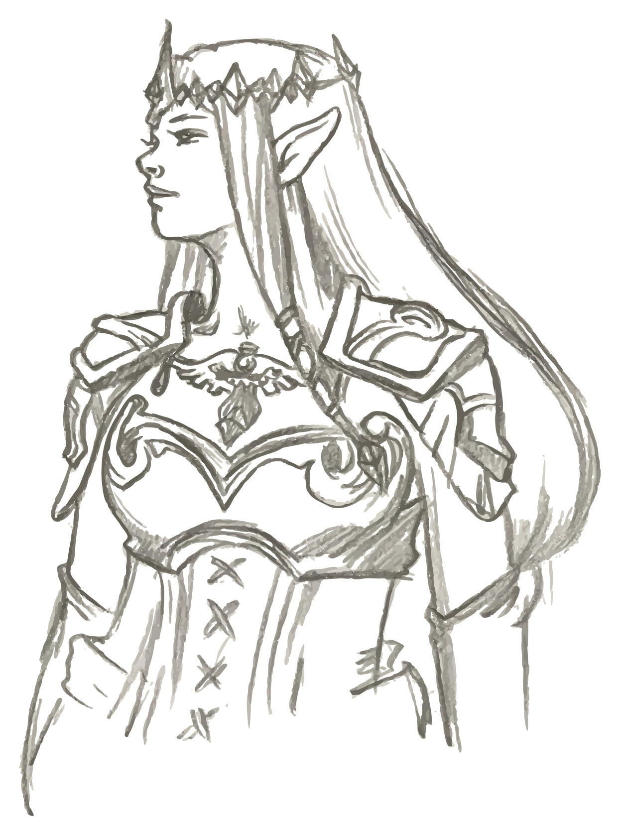 This is a drawing of an elf princess, who appears to be wearing a crown and has long hair. She is dressed in a body armor suit and has pointy ears, giving her the appearance of an elf. Her gaze is directed towards the left side of the frame. The drawing captures the essence of the character's unique features, such as her elf ears and her attire, which includes a crown.