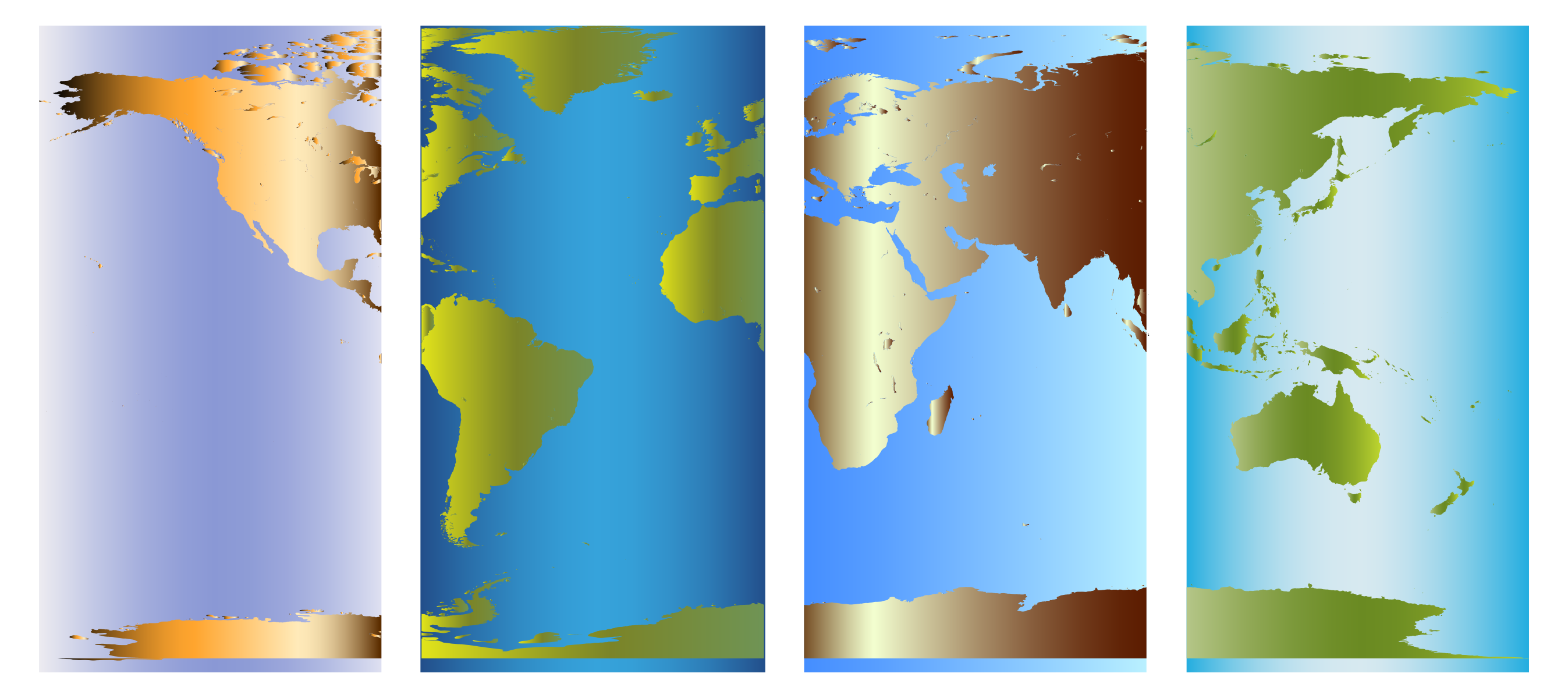 This features a series of four different colored world maps, each with unique shades and hues. These maps are displayed side by side, showcasing the diversity in color schemes used to represent the Earth's continents and countries. The first map is predominantly blue, while the second one has a more greenish tint. The third map displays a combination of brown and blue shades, and the fourth map features a striking orange hue. Each map captures different aspects of the world, highlighting various regions and their unique characteristics.