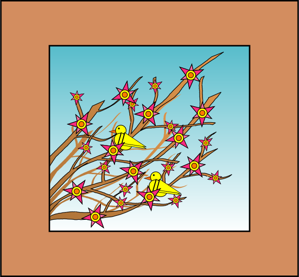 This features a beautifully drawn tree with pink and yellow flowers, as well as birds perched on its branches. There are several birds in the scene, some of which are sitting close to each other while others are spread out across the tree. The vibrant colors and intricate details make this artwork an eye-catching piece that captures the essence of nature.