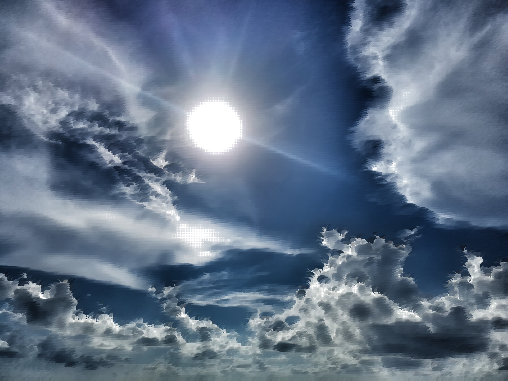 This features a cloudy blue sky with the sun peeking through, creating an interesting contrast between light and shadow. The clouds are scattered throughout the scene, some closer to the foreground while others extend further into the distance. The sunlight shines brightly in the middle of the sky, illuminating the clouds and casting a warm glow on the landscape below. This picturesque view captures the beauty of nature as it unfolds before our eyes.