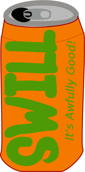This features a colorful can of soda called "Swill," which is a fictional soft drink. The can has an orange and green background with the word "Swill" written in large, bold letters. Above the word "Swill," there are two exclamation points to emphasize the excitement behind this beverage. This creative design makes it stand out as a unique and fun product that is likely to catch people's attention.