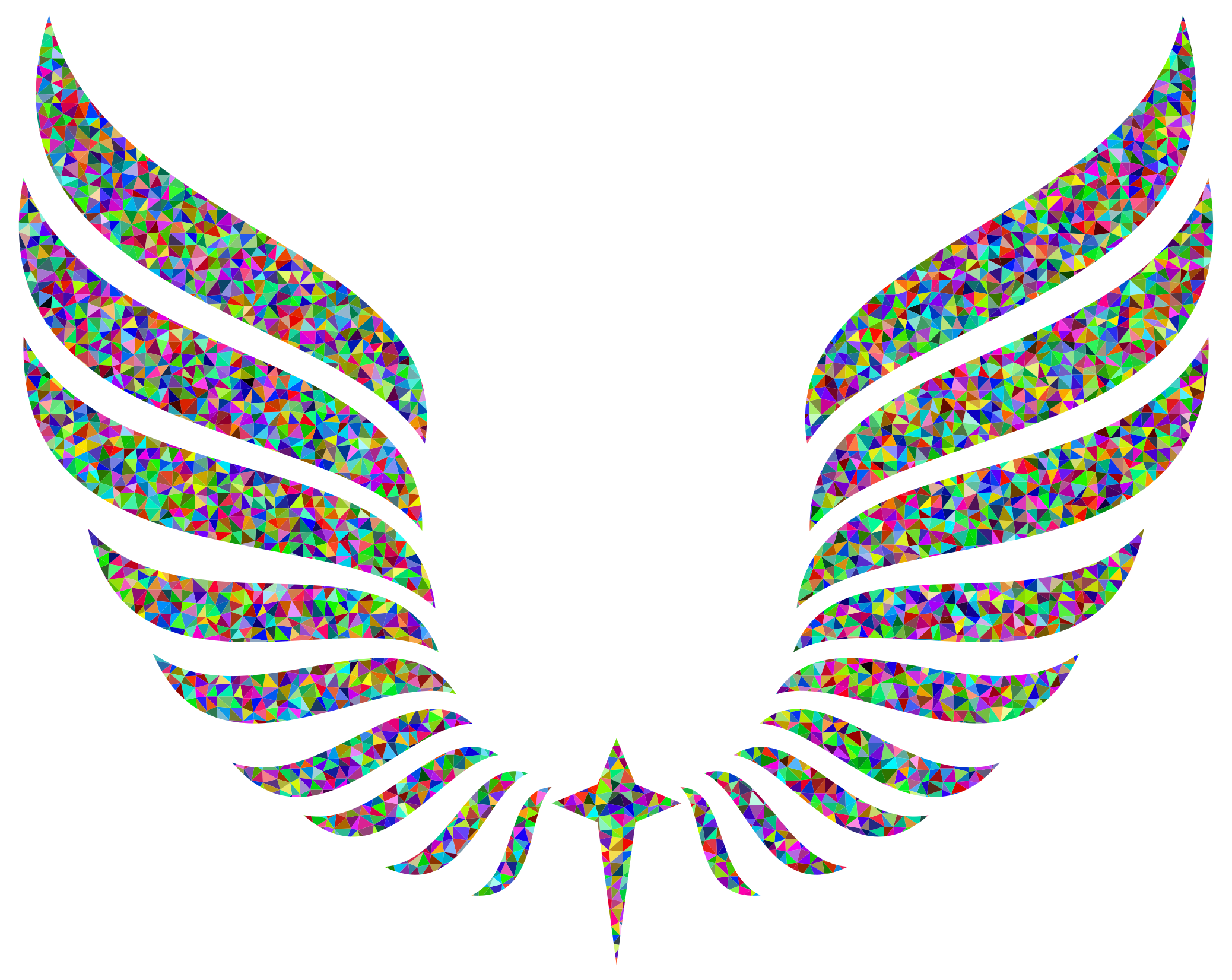 This features a colorful and intricate design of two wings, each made up of numerous small prismatic pieces. These wings are positioned next to each other, creating an eye-catching visual effect. In the middle of these wings, there is a star that adds to the overall beauty of the design. The combination of vibrant colors and intricate patterns make this image stand out as a unique and captivating piece of artwork.