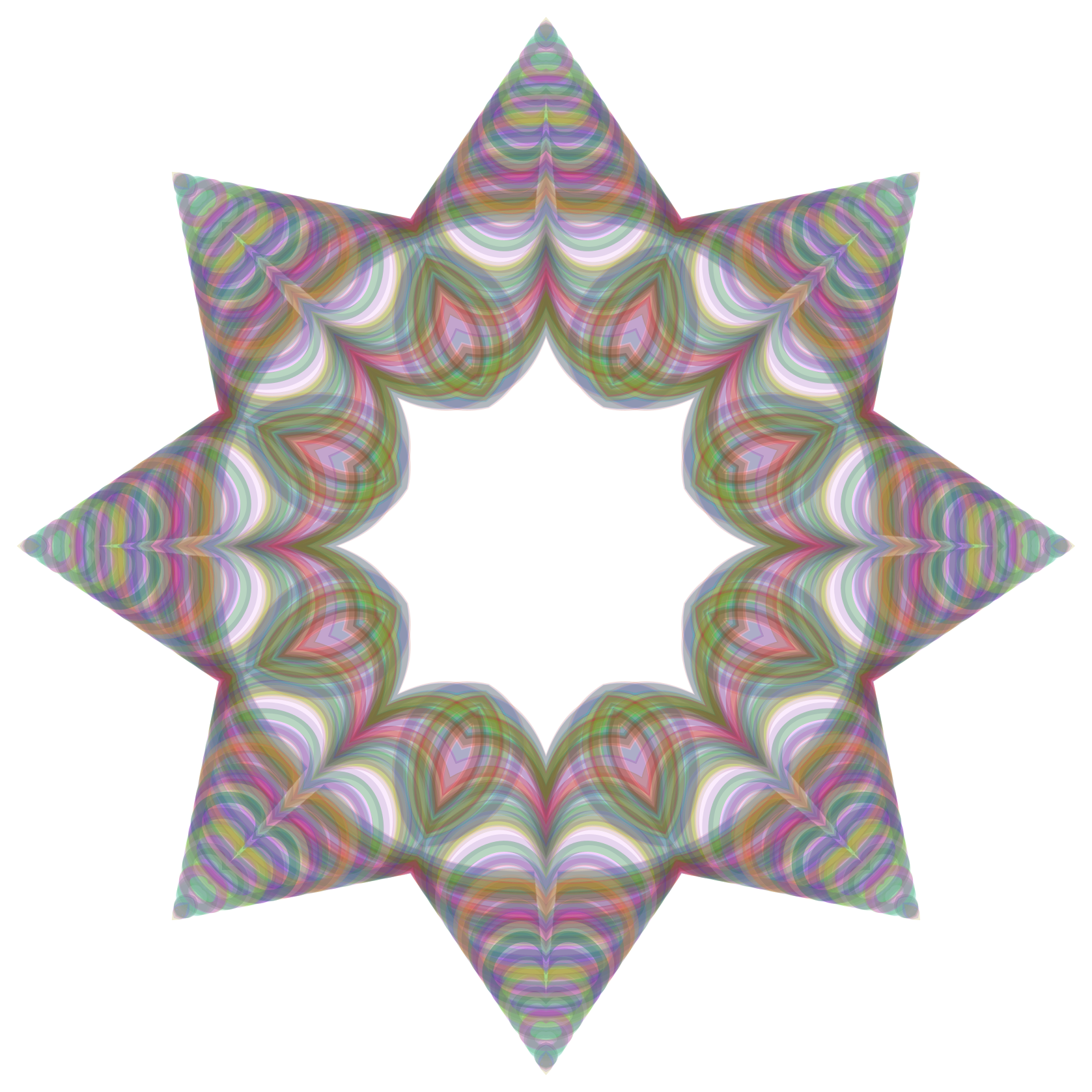 This features a large, colorful star with many points. It is an abstract design that appears to be faded in some areas. The center of the star has a white halo, which adds contrast and interest to the overall pattern. The vibrant colors and intricate details make this star stand out as a unique and eye-catching piece of artwork.