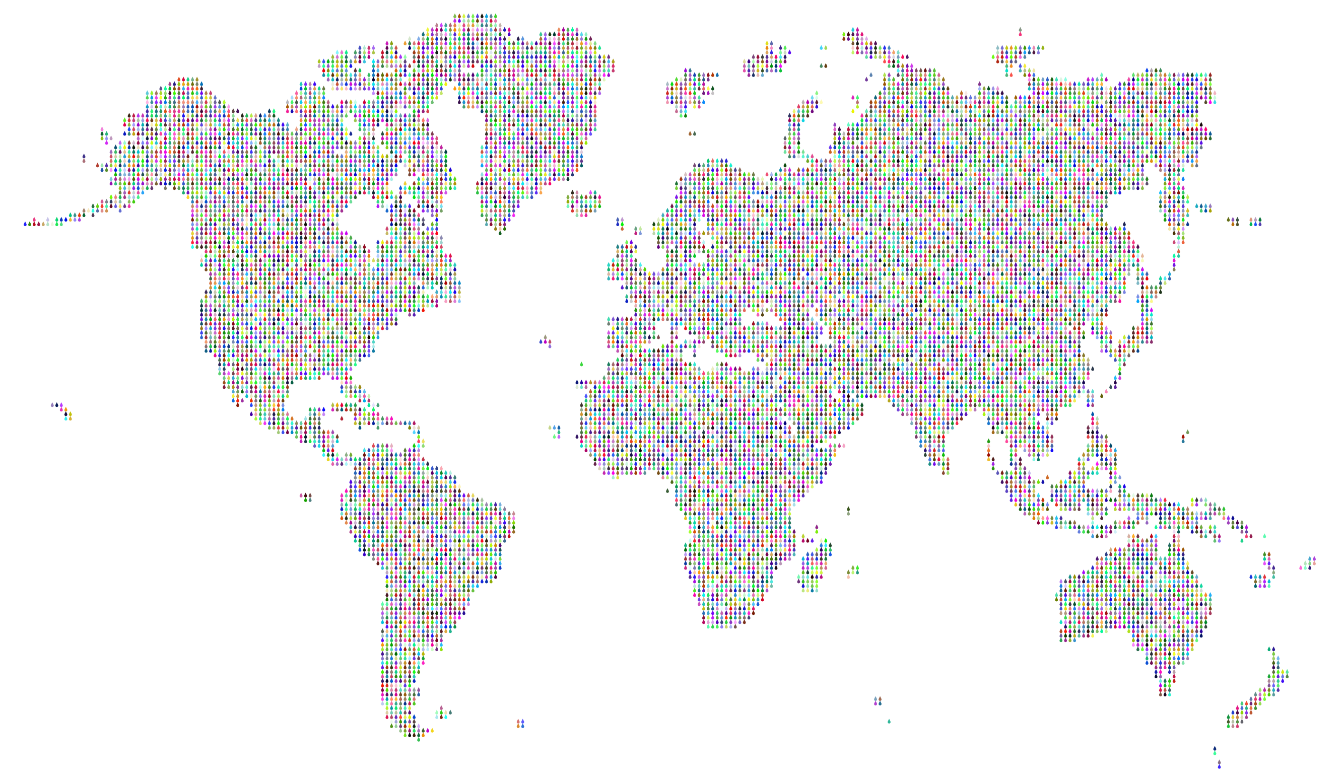 This features a large, colorful map of the world made up of tiny colored dots. These dots are arranged in such a way that they form the continents and countries on the globe. The map is divided into different sections, each representing a specific region or country. The colors used for the dots vary, creating a visually appealing and diverse representation of the world. This unique approach to mapping showcases the intricate details of our planet while maintaining an artistic and creative touch.