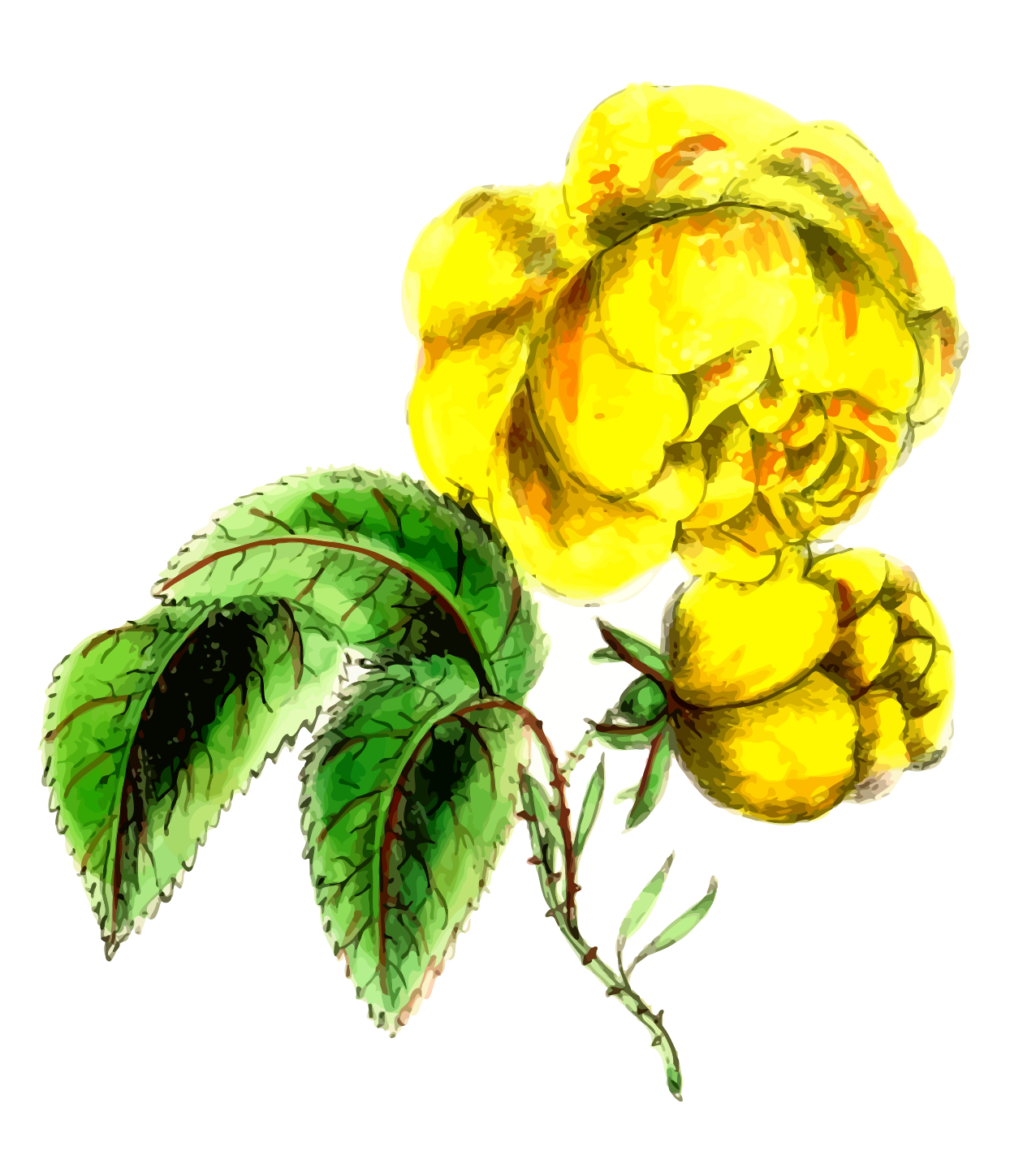 This features a yellow flower with green leaves, sitting on top of a branch. The flower is the main focus of the scene and appears to be in full bloom. The leaves surrounding the flower are vibrant green, adding a lively touch to the overall composition. The drawing style gives it an artistic and detailed appearance, making it an appealing visual representation of nature's beauty.