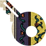 This features a key with an intricate floral design, placed diagonally in the center of the picture. The key has a round top and is surrounded by a colorful pattern that adds to its visual appeal. This unique combination of elements creates an interesting focal point for the viewer.