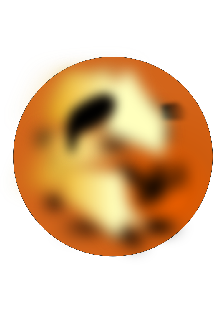 This features a round, orange object with a blurry picture of a dog on it. The dog appears to be wearing sunglasses and has its mouth open, giving the impression that it is yawning or panting. The overall effect of the image is somewhat distorted due to the blurriness of the photo.