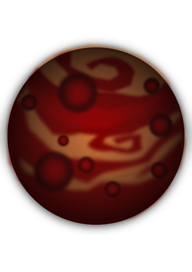 This features a close-up of an oddly shaped red object, which appears to be a planet or a ball. It has a dark shadow outline and is surrounded by numerous small circles that are scattered around it. These circles vary in size and position, creating a visually interesting scene. The overall composition of the image gives off a sense of depth and intrigue, as the viewer tries to make out what this peculiar object might be.