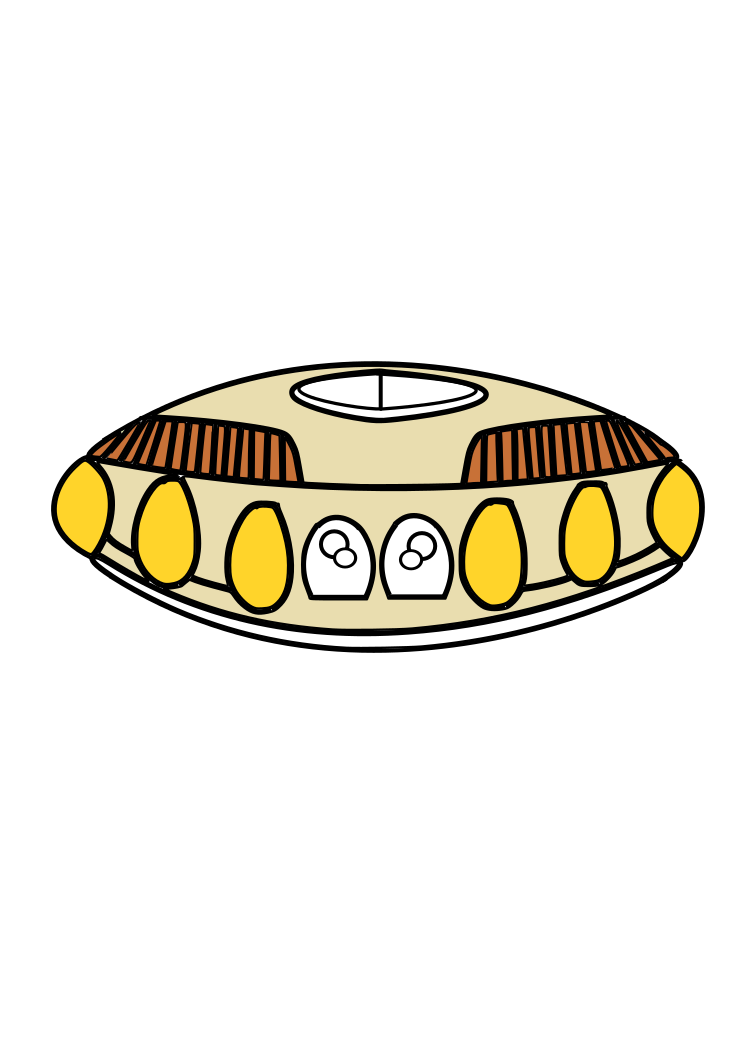This features a round, light tan object with a hole in the center. It appears to be an alien spacecraft or a piece of artwork that resembles one. The craft is adorned with several yellow buttons arranged around its circumference, giving it a unique and interesting appearance. The combination of the round shape, central hole, and the yellow buttons creates a visually appealing and intriguing design.