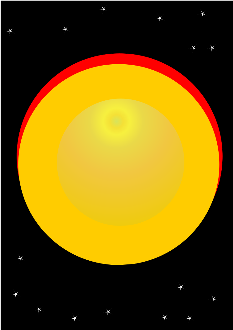 This features a yellow sun with a red outline on top, depicted in a black background. The sun is the main focus of the picture and appears to be the center of attention. In addition to the sun, there are several stars scattered throughout the scene, adding depth and interest to the overall composition. These stars are positioned at various distances from the sun, creating an illusion of depth in the image.