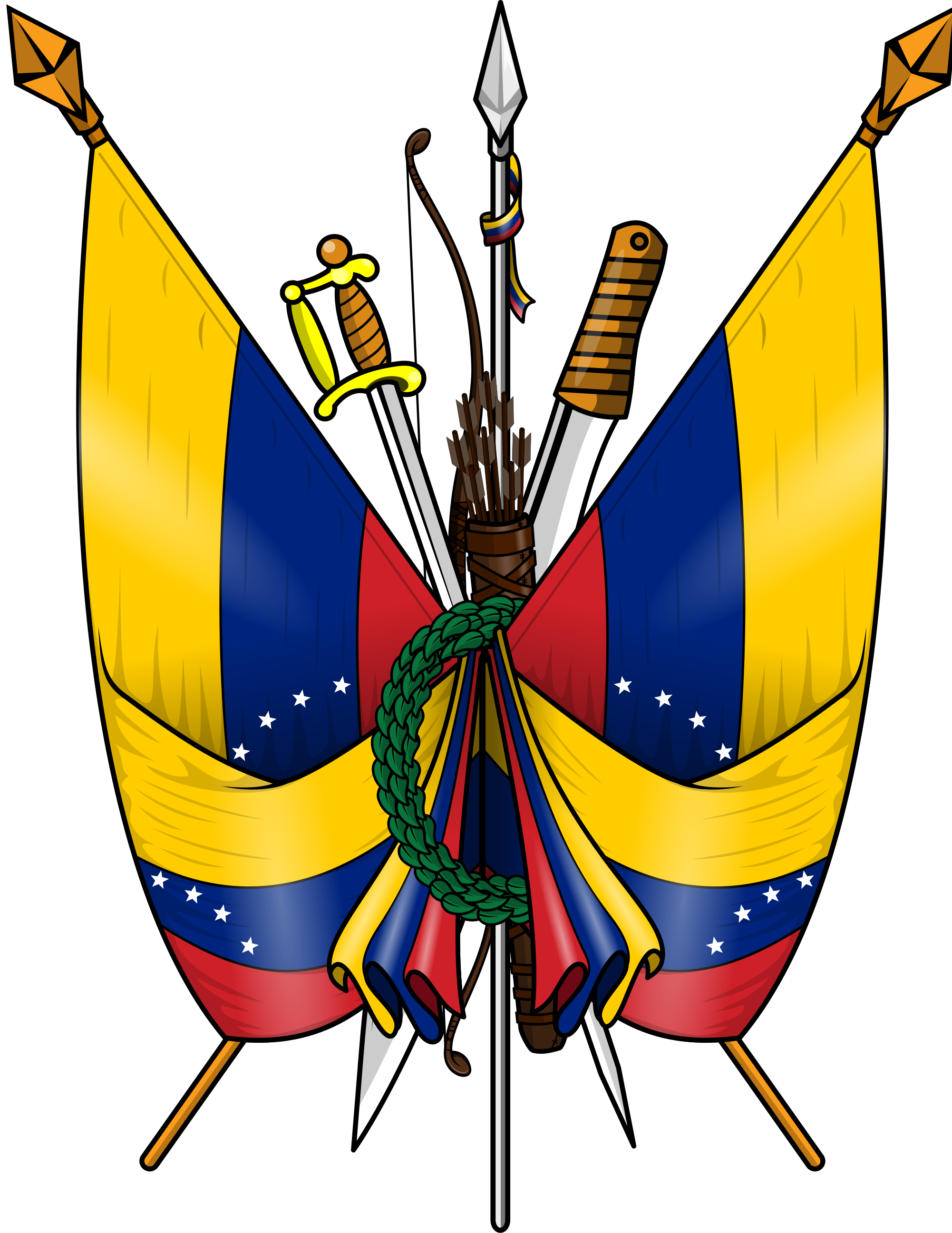 This features a unique design that combines two flags of Venezuela with various swords. The flags are positioned in the center, and they appear to be held together by the swords. There is also an additional flag on the right side of the scene. The arrangement of these elements creates a visually striking composition that showcases the connection between the flags and the swords.