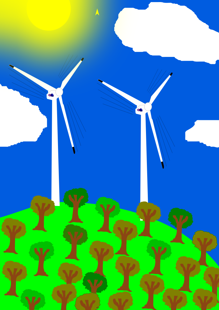 This features a lush green field with many trees, creating an idyllic and serene landscape. In the midst of this natural setting, two windmills are prominently placed on top of a hill, adding a touch of human ingenuity to the scene. The sun is shining brightly in the sky above these windmills, casting its warm light over the entire field, and creating a picturesque view that captures the essence of nature's beauty combined with modern technology.