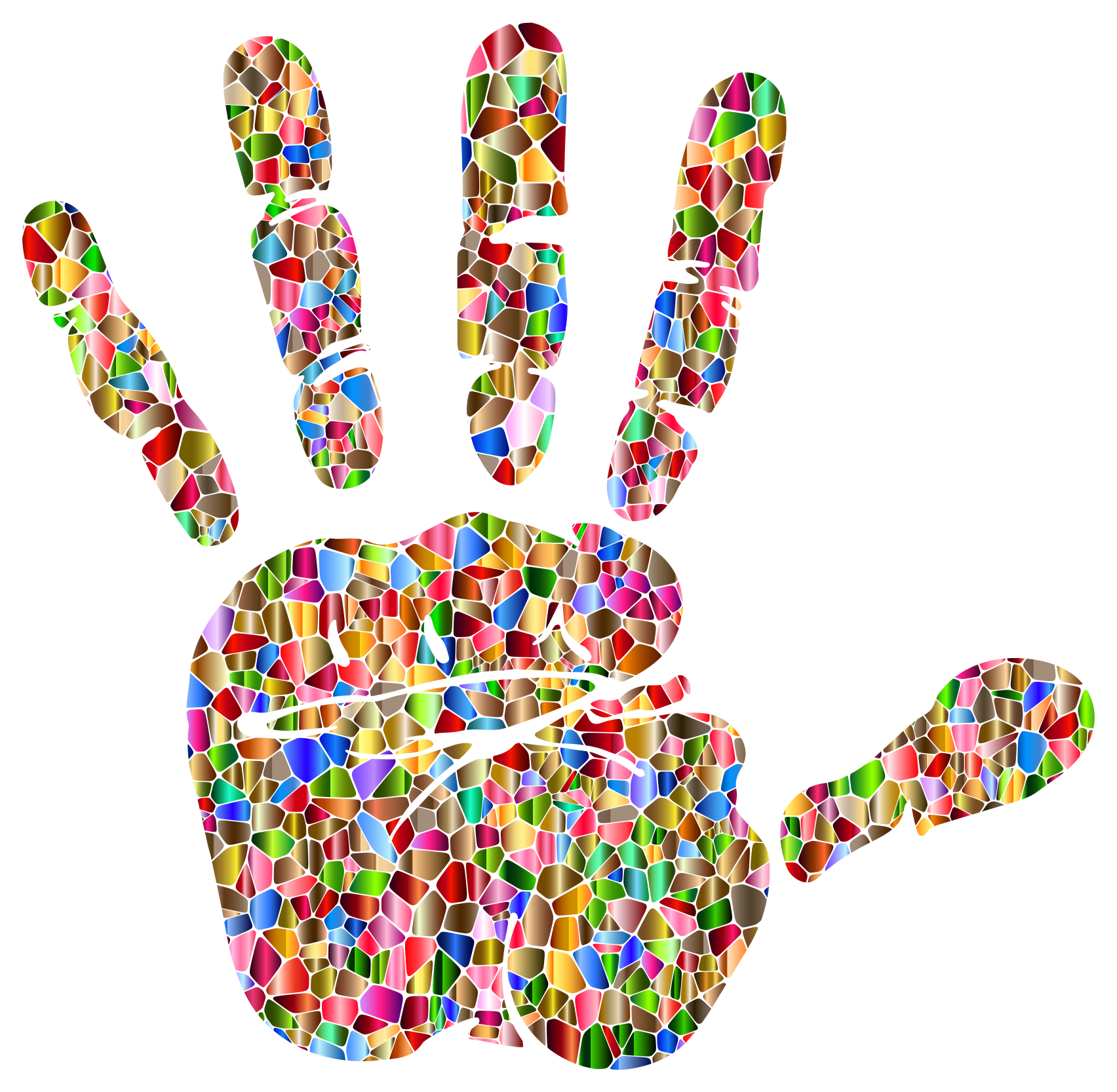 This features a handprint made out of small, colorful pieces. These pieces are arranged in such a way that they form the shape of a hand, with fingers and a thumb clearly visible. The colors used for this artistic representation are vibrant and eye-catching, making it an interesting visual piece. The handprint is displayed on a white background, which allows the colorful pieces to stand out even more prominently. This unique design showcases creativity and attention to detail in its execution.