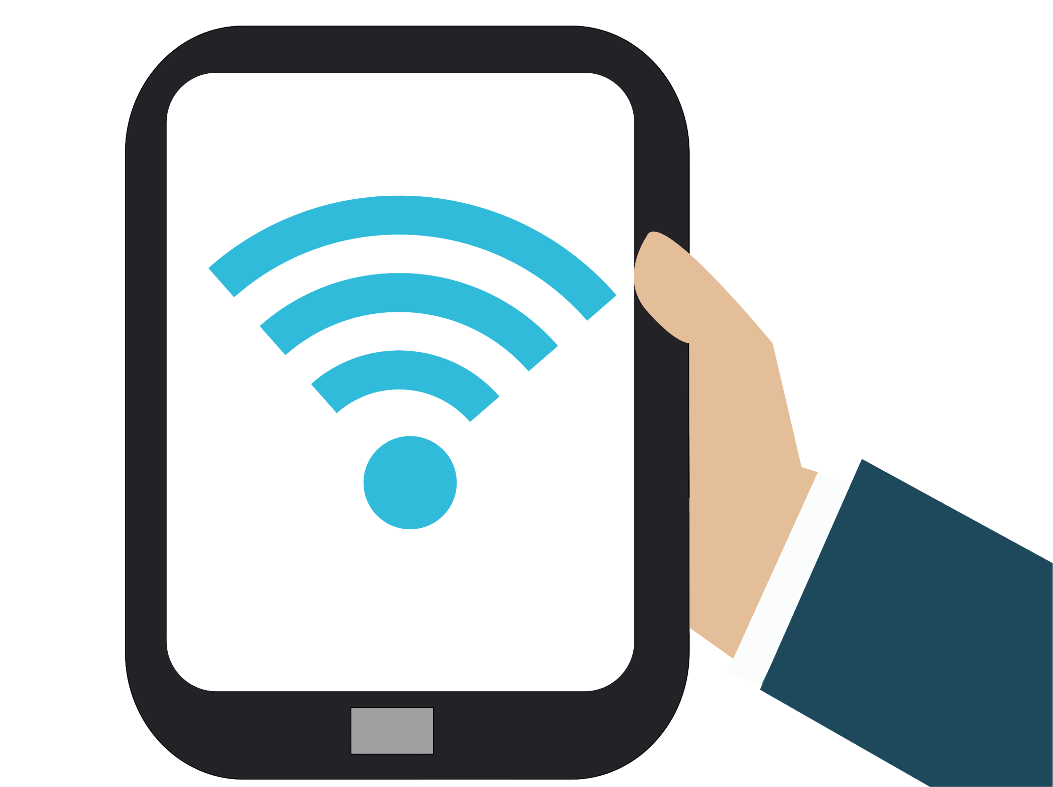This features a person's hand holding an electronic device, likely a tablet or smartphone. The device is displaying a Wi-Fi signal, indicating that it is connected to the internet. The hand is positioned above the screen of the device, emphasizing its connection to the Wi-Fi network. This scene could represent someone using their device for various purposes such as browsing the web, streaming content or communicating with others online.
