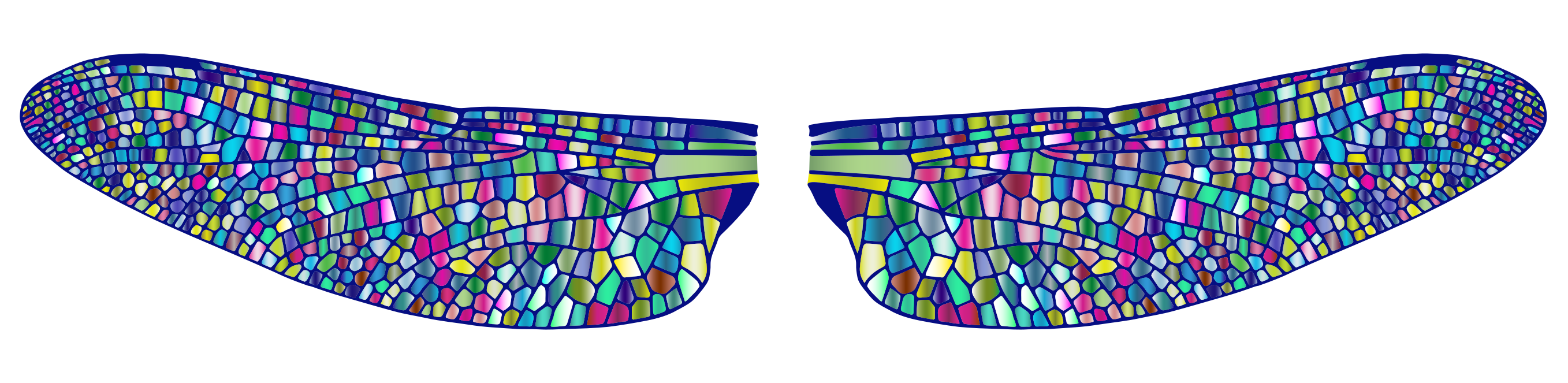 This features a pair of colorful dragonfly wings, each with a unique design. These wings are made out of prismatic pieces that create an eye-catching and vibrant appearance. The individual pieces of the wings are glossy, adding to their visual appeal. The wings are positioned side by side, showcasing the intricate patterns and colors that make them stand out as a piece of art.