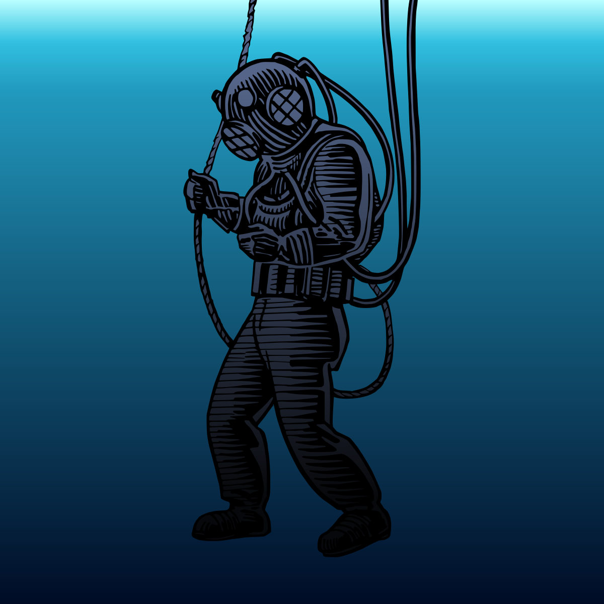 This features a person dressed in deep sea diving gear, standing underwater and holding onto a rope. They are wearing a full suit with an oxygen tank attached to their back, indicating that they are likely engaged in a dive or exploration of the ocean depths. The person appears to be focused on something in front of them, possibly observing marine life or examining underwater features. The scene is set against a dark blue background, which adds to the overall atmosphere and emphasizes the depth of the water.