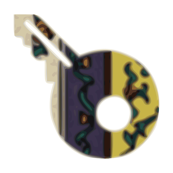This features a colorful key with a yellow, green, and purple design. It is an artistic representation of a key, possibly inspired by the "Cloth Key" design. The key has a unique pattern that makes it stand out from typical keys. The vibrant colors and intricate details give the impression of a decorative piece rather than a functional item for unlocking doors or cabinets.