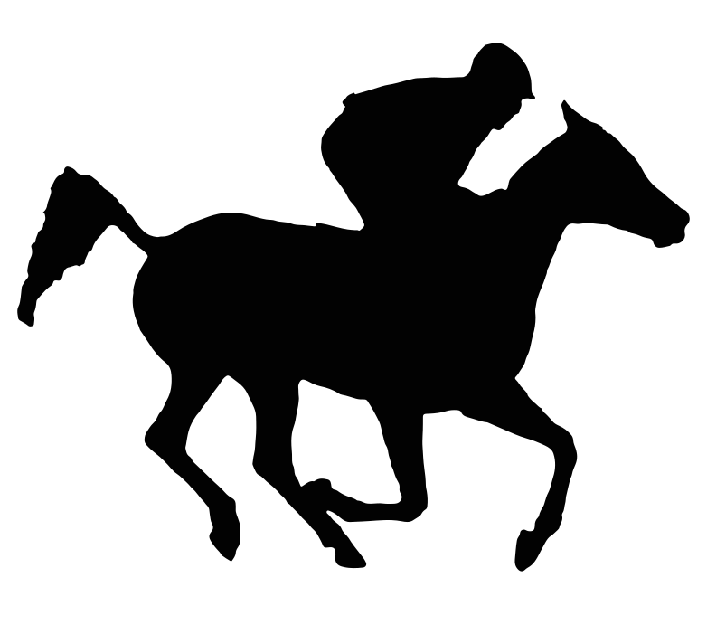 This features a silhouette of a jockey riding a racehorse. The jockey is skillfully positioned on the horse, with his legs spread out to maintain balance and control during the race. The horse appears focused and determined as it runs towards the right side of the image. This black and white illustration captures the essence of equestrian sports and the bond between the rider and the horse.