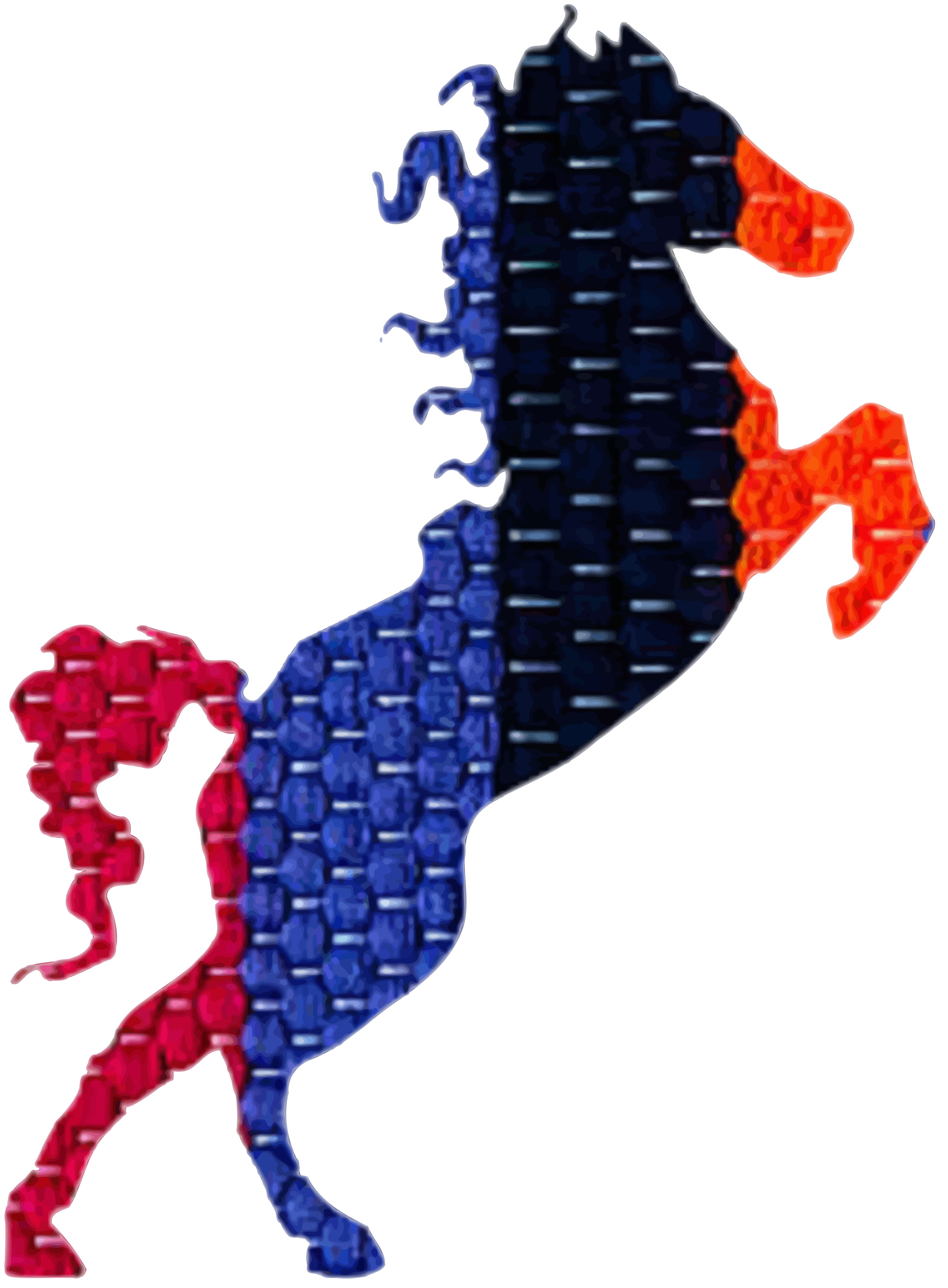 This features a unique and colorful representation of a horse. This artistic depiction is made up of various colors, including red, blue, black, orange, and white. The horse's mane is colored in shades of blue and black, while its body has an orange hue. The tail of the horse is also painted with a combination of red and blue colors. This creative representation of a horse showcases the artist's skill in combining different colors to create a visually appealing image.