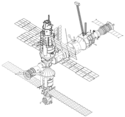 This is a drawing of a space station, likely inspired by the MIR Space Station. It features an array of satellite dishes and antennas attached to its structure, indicating that it may be used for communication or scientific purposes. There are several pipes visible on the space station as well, which could be related to fuel storage or other essential functions. The drawing is in black and white, giving it a classic feel and emphasizing the details of the space station's design.
