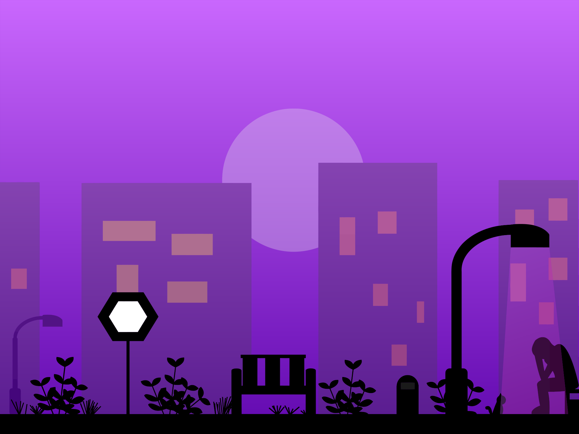 This depicts a city scene at night with a man sitting on a bench. In the background, there is a full moon rising above the buildings, creating an atmospheric setting. There are four buildings visible in the scene, one of which has a stop sign placed near it. Additionally, there is a traffic light situated further back in the image. The overall composition of the scene gives off a sense of calmness and tranquility despite being set in a bustling urban environment.